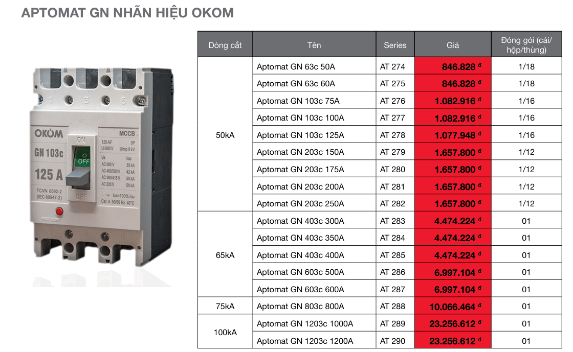 | MCCB 3 pha: GN103c | AT276 | Màu trắng xám | 75A | 01 cái/hộp đơn, 16 cái/hộp kiện |