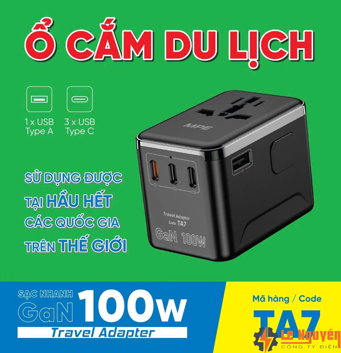 Ổ cắm du lịch đa năng,Tích hợp 3 cổng USB-C, 1 cổng USB-A, sạc nhanh GaN 100W mã TA7