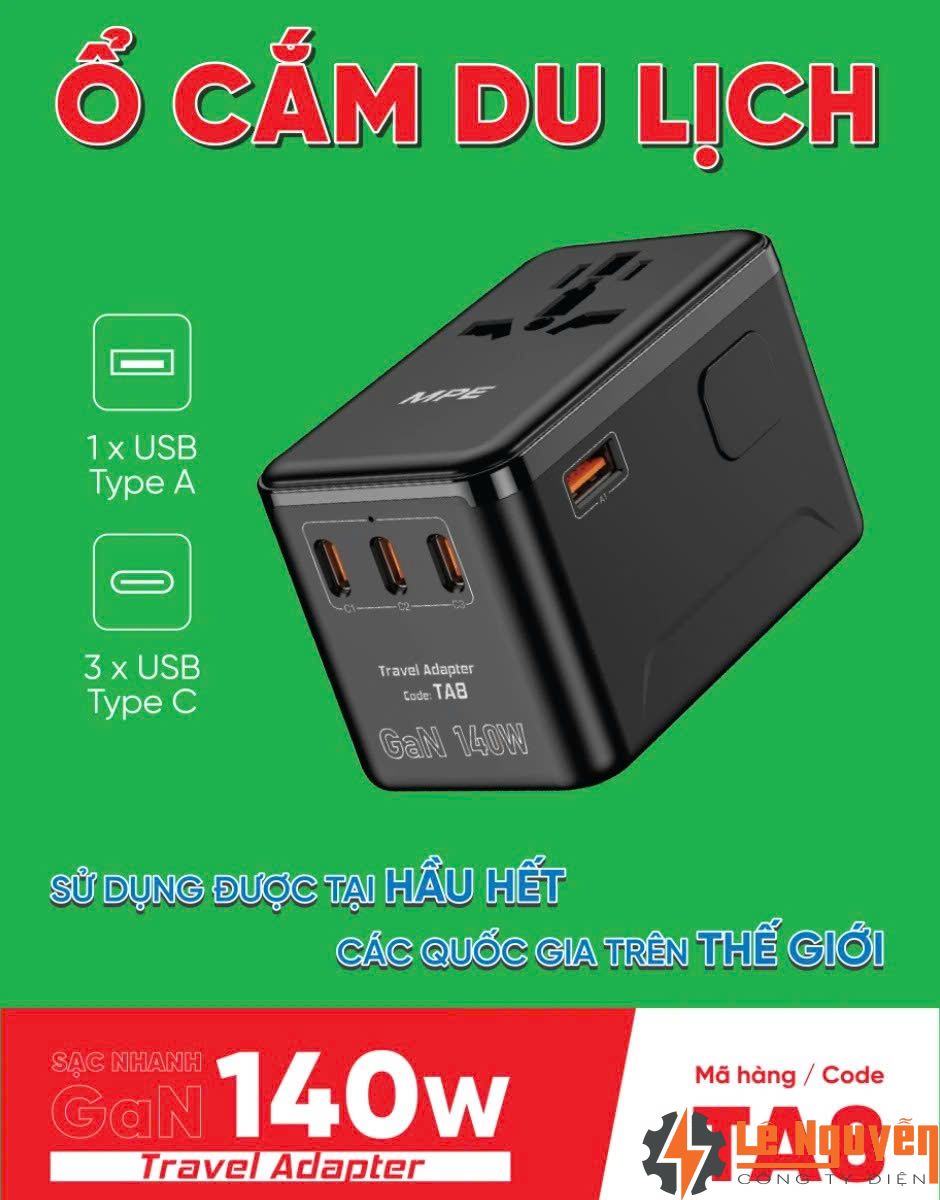 Ổ cắm du lịch đa năng,Tích hợp 3 cổng USB-C, 1 cổng USB-A, sạc nhanh GaN 140W mã TA8